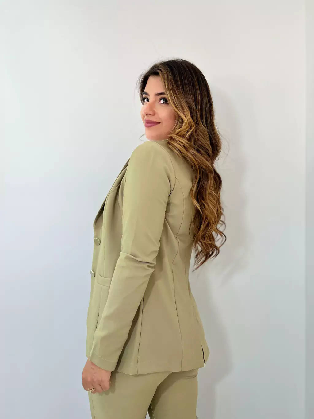 Blazer Feminino em Alfaiataria Paula Verde Oliva, uma peça clássica com um toque extra de estilo! Confeccionado no tecido Gabardine Bi Elastic , também conhecido como Two Way, que tem como principais características a elasticidade e durabilidade, além de não amassar com facilidade e possuir um caimento mais pesado.